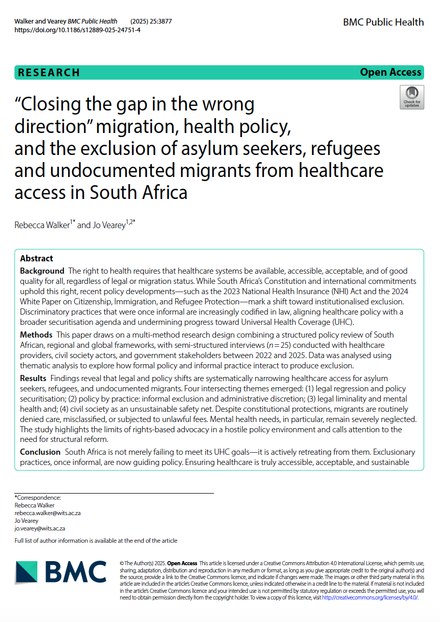 Walker, R., Vearey, J. “Closing the gap in the wrong direction” migration, health policy, and the exclusion of asylum seekers, refugees and undocumented migrants from healthcare access in South Africa. BMC Public Health 25, 3877 (2025). https://doi.org/10.1186/s12889-025-24751-4