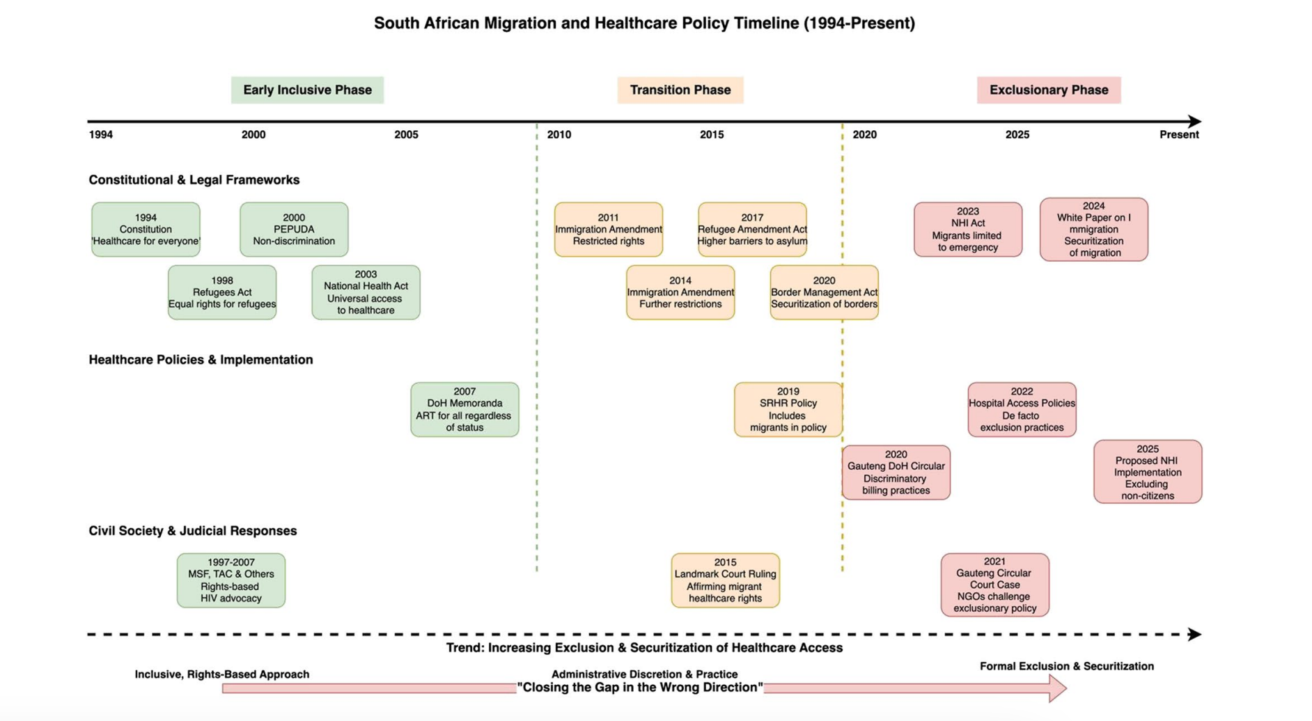 The right to health requires that healthcare systems be available, accessible, acceptable, and of good quality for all, regardless of legal or migration status. While South Africa’s Constitution and international commitments uphold this right, recent policy developments — such as the 2023 National Health Insurance (NHI) Act and the 2024 White Paper on Citizenship, Immigration, and Refugee Protection — mark a shift toward institutionalised exclusion. Discriminatory practices that were once informal are increasingly codified in law, aligning healthcare policy with a broader securitisation agenda and undermining progress toward Universal Health Coverage (UHC). This paper draws on a multi-method research design combining a structured policy review of South African, regional and global frameworks, with semi-structured interviews (n = 25) conducted with healthcare providers, civil society actors, and government stakeholders between 2022 and 2025. Data was analysed using thematic analysis to explore how formal policy and informal practice interact to produce exclusion. Findings reveal that legal and policy shifts are systematically narrowing healthcare access for asylum seekers, refugees, and undocumented migrants.