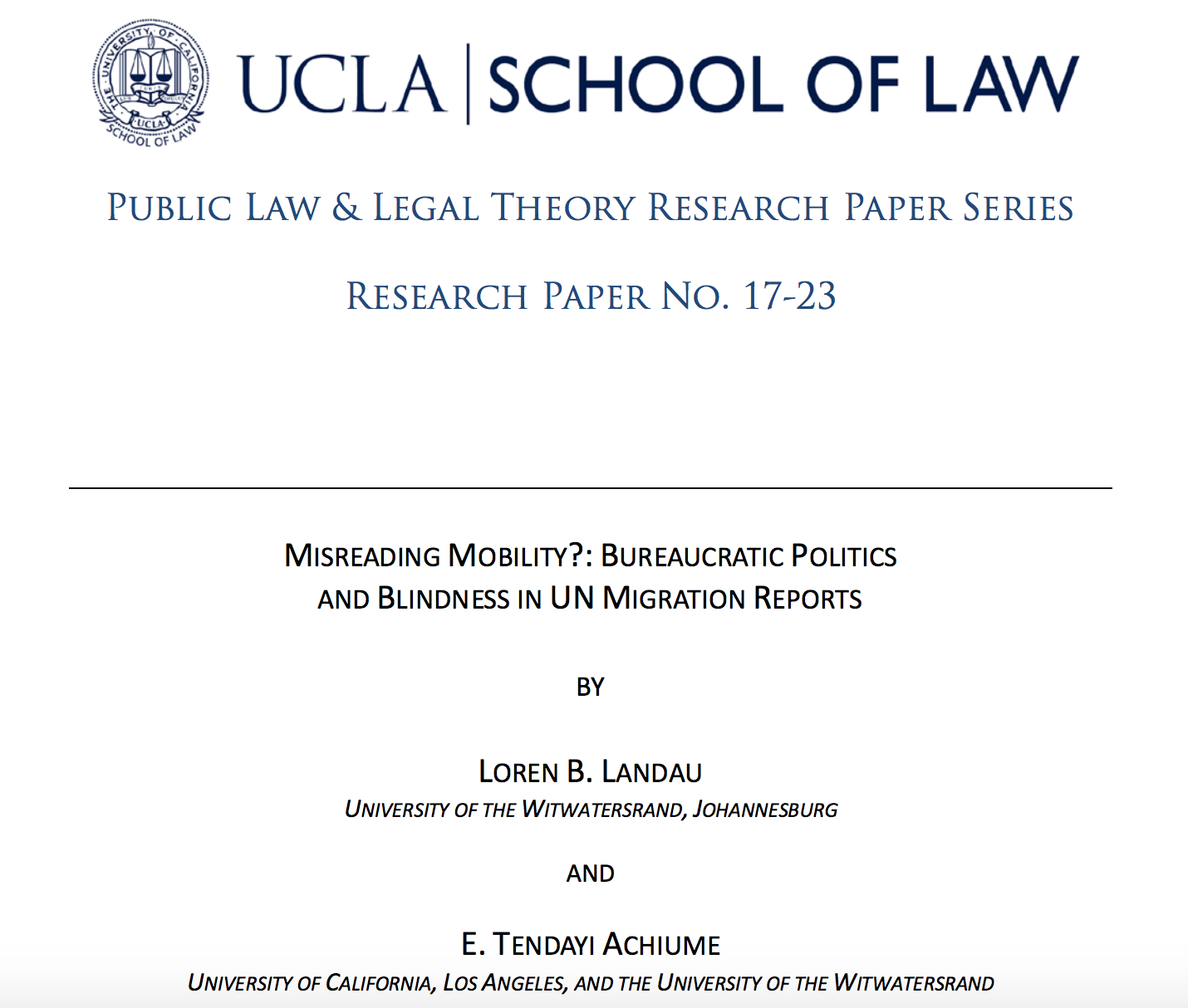 Landau, L.B., Achiume, E.T. 2017. Misreading mobility?: Bureaucratic politics and blindness in the United Nations’ migration reports. Development & Change, 48, 1182-1195.