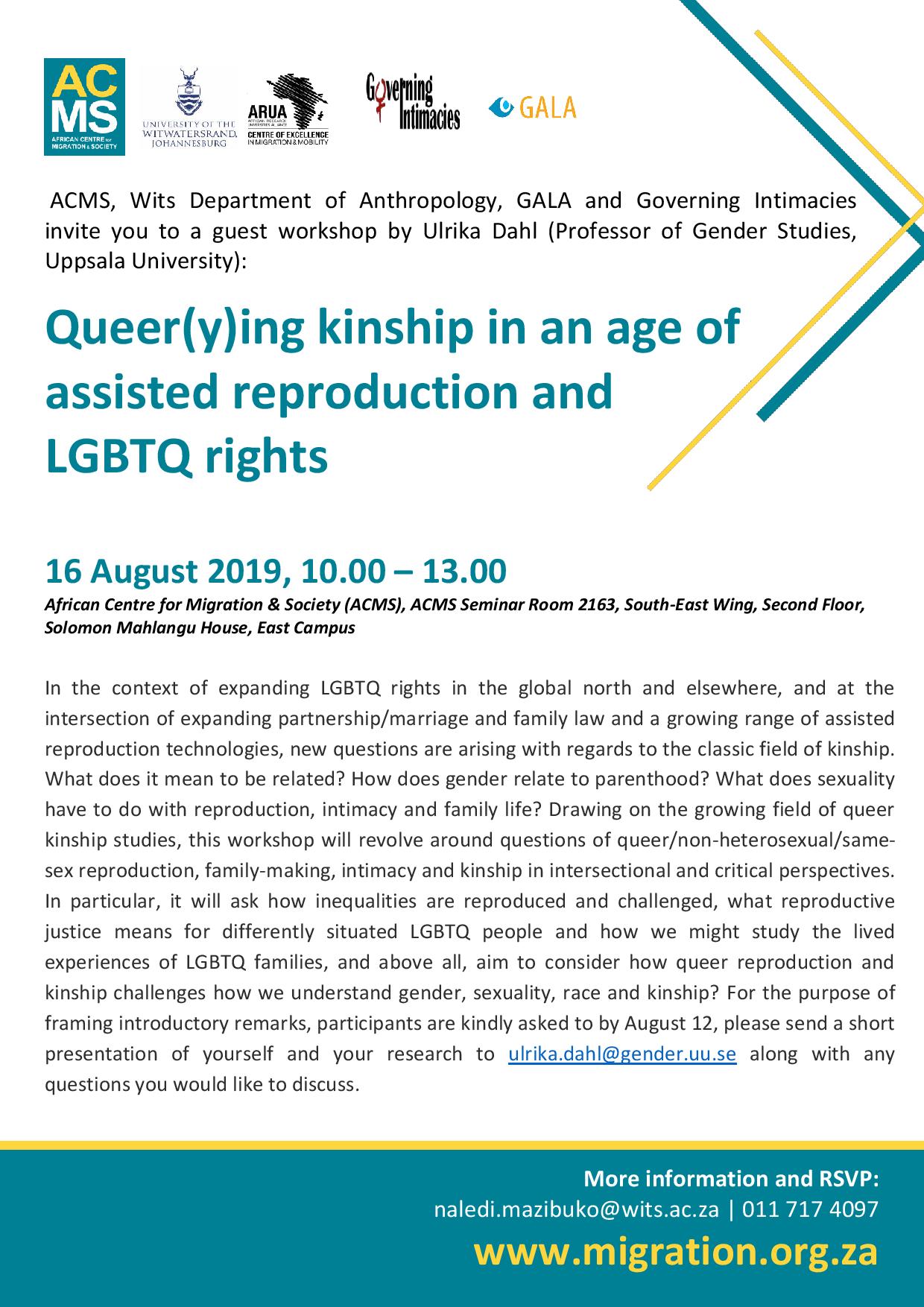 The African Centre for Migration & Society, Wits Department of Anthropology, GALA and Governing Intimacies invite you to a guest workshop by Ulrika Dahl (Professor of Gender Studies, Uppsala University) on Queer(y)ing kinship in an age of assisted reproduction and LGBTQ rights.