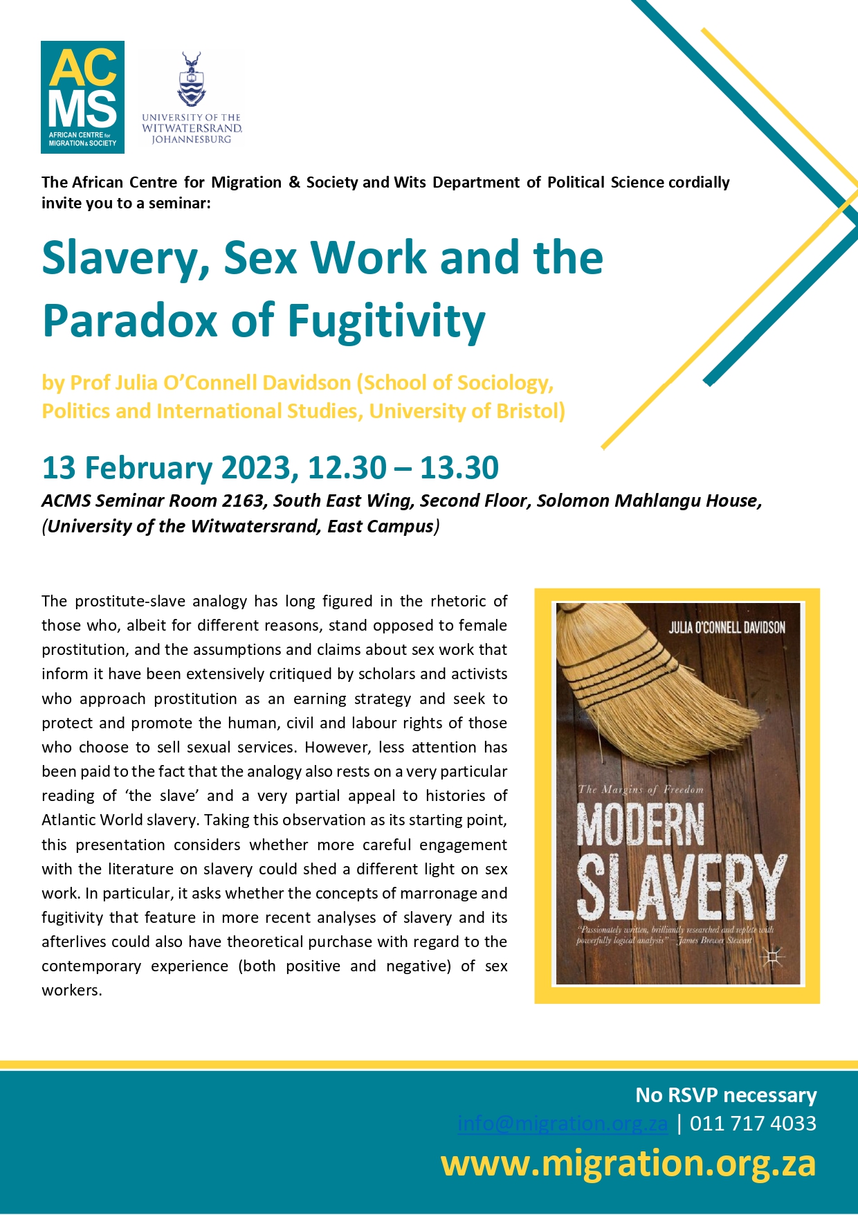 The African Centre for Migration & Society and Wits Department of Political Science cordially invite you to a seminar by Professor Julia N O’Connell Davidson (Professor in Social Research, School of Sociology, Politics and International Studies, University of Bristol) titled Slavery, Sex Work and the Paradox of Fugitivity.