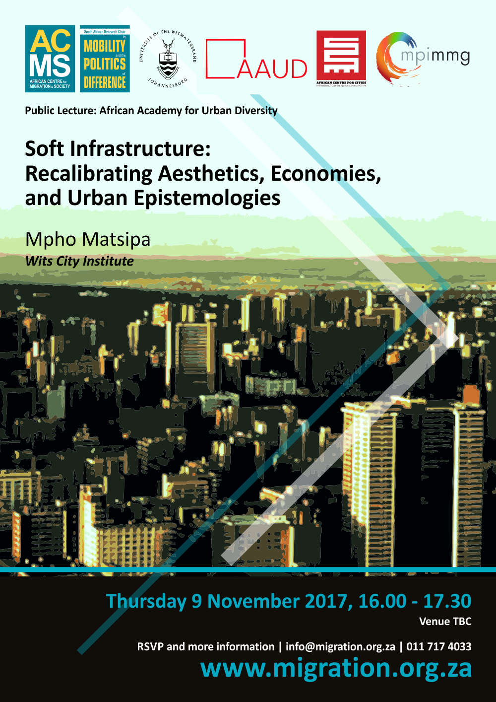 The Academy for African Urban Diversity; a joint initiative of the African Centre for Migration & Society; the African Centre for Cities; and the Max Planck Institute for the Study of Religious and Ethnic Diversity invites you to a special public lecture by Dr Mpho Matsipa (Wits City Institute, University of the Witwatersrand, Johannesburg).